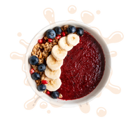 100g de açaí congelado (100 g aprox.), ½ plátano congelado, ½ taza de frutos rojos, 1 shot de kéfir natural, cucharadita de miel o dátil.