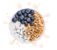 1/2 taza de yogurt griego, un shot de kéfir, ½ plátano en rodajas, ¼ taza de blueberries frescas, ¼ taza de granola natural, 1 cucharadita de semillas de chía o linaza (opcional) y un toque de miel o canela (opcional).